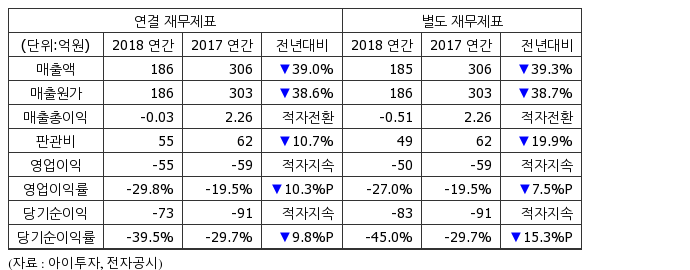 지난해 연간 기준 연결 매출액은 186억4014만원으로 전년 동기 306억326만원 대비 39% 감소했다.