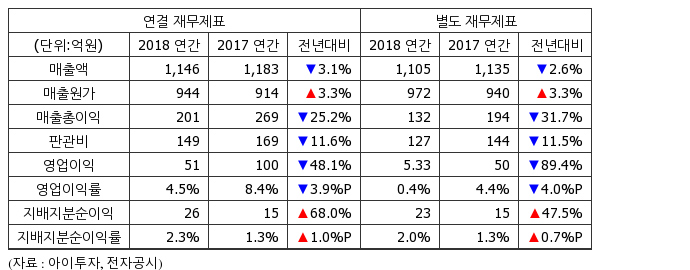 지난해 연간 기준 연결 매출액은 1146억2706만원으로 전년 동기 1183억7890만원 대비 3.1% 감소했다.