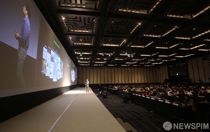 [서울=뉴스핌] 윤창빈 기자 = 김광현 네이버 서치앤클로버 이사가 5일 오전 서울 강남구 그랜드인터컨티넨탈 호텔에서 열린 2019 네이버 AI 콜로키움에서 기조연설을 하고 있다. 2019.04.05 pangbin@newspim.com
