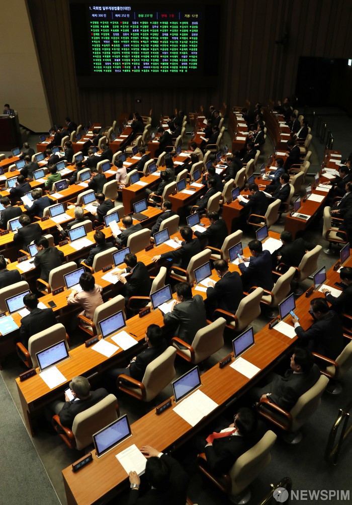 [서울=뉴스핌] 김학선 기자 = 5일 국회에서 열린 본회의에서 법안이 처리되고 있다. 이날 본회의에서는 법제사법위원회 전체회의를 통과한 ‘임세원법’ 등 130여개 법안을 의결한다. 2019.04.05 yooksa@newspim.com