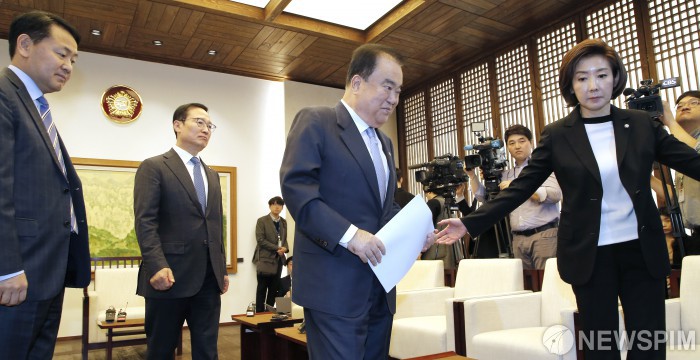 [서울=뉴스핌] 김학선 기자 = 문희상 국회의장과 여야 원내대표들이 8일 국회에서 열린 국회의장 주재 5당 원내대표 회동을 마치고 의장접견실을 나서고 있다. 2019.04.08 yooksa@newspim.com