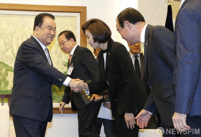 [서울=뉴스핌] 김학선 기자 = 문희상 국회의장이 8일 국회에서 열린 국회의장 주재 5당 원내대표 회동에서 원내대표들과 악수하고 있다. 2019.04.08 yooksa@newspim.com