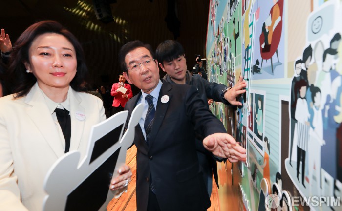 [서울=뉴스핌] 최상수 기자 = 박원순 서울시장이 홍보대사 배우 김나운, 시민찾동이들과 9일 오후 서울 중구 서울시청에서 열린 찾동 2.0 출범식 및 시민찾동이 발대식에서 '시민찾동이와 함께 골목 만들기' 퍼포먼스를 하고 있다. 2019.04.09 kilroy023@newspim.com