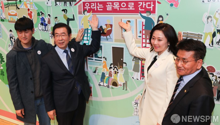 [서울=뉴스핌] 최상수 기자 = 박원순 서울시장이 홍보대사 배우 김나운, 시민찾동이들과 9일 오후 서울 중구 서울시청에서 열린 찾동 2.0 출범식 및 시민찾동이 발대식에서 '시민찾동이와 함께 골목 만들기' 퍼포먼스를 하고 있다. 2019.04.09 kilroy023@newspim.com