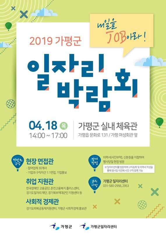 유양덕 가평군 일자리경제과장은 “취업 희망자와 구인기업을 연결하고 지역경제 활성화의 첫 출발점이 되고자 마련된 일자리 박람회에 구직 희망자의 많은 참여를 바란다”고 말했다.