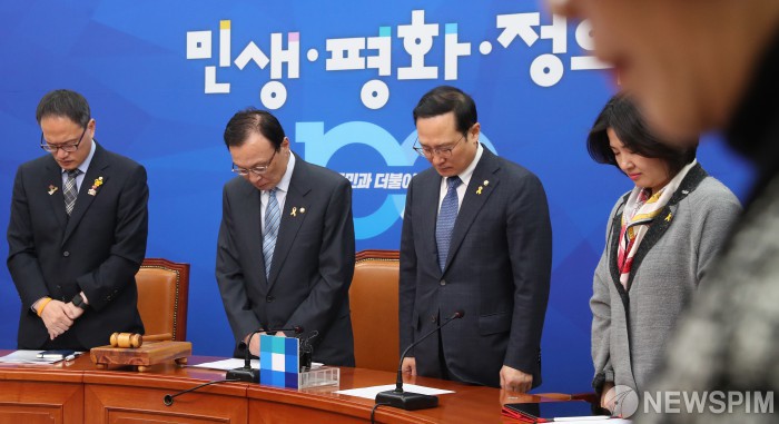 [서울=뉴스핌] 김학선 기자 = 이해찬 더불어민주당 대표, 홍영표 원내대표 등 최고위원들이 15일 국회에서 열린 최고위원회의에서 세월호 5주기를 앞두고 묵념을 하고 있다. 2019.04.15 yooksa@newspim.com