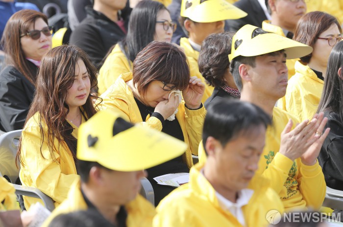 [안산=뉴스핌] 이형석 기자 = 16일 오후 경기도 안산시 단원고 화량유원지에서 열린 세월호참사 5주기 기억식에서 유가족과 시민들이 눈물을 흘리고 있다. 2019.04.16 leehs@newspim.com