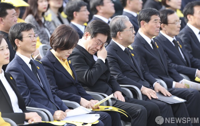 [안산=뉴스핌] 이형석 기자 = 이재명 경기도 지사가 16일 오후 경기도 안산시 단원고 화량유원지에서 열린 세월호참사 5주기 기억식에서 눈물을 흘리고 있다. 2019.04.16 leehs@newspim.com