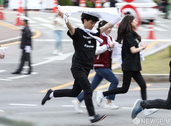 [서울=뉴스핌] 윤창빈 기자 = 18일 오후 서울 성북구 고려대학교에서 열린 '4·18 구국대장정' 행사에서 학생들이 행진을 하고 있다. 고려대학교 4.18 기념 행사는 4·19 혁명의 도화선이 되었던 1960년 4월 18일 고려대 학생들의 의거를 기념하는 행사이다. 2019.04.18 pangbin@newspim.com