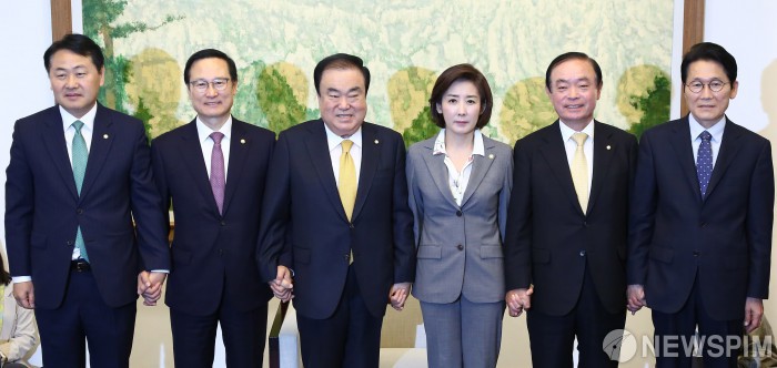 [서울=뉴스핌] 김학선 기자 = 문희상 국회의장과 여야 5당 원내대표가 22일 국회 의장접견실에서 열린 정례회동에 앞서 기념촬영을 하고 있다. 왼쪽부터 김관영 바른미래당 원내대표, 홍영표 더불어민주당 원내대표, 문 의장, 나경원 자유한국당 원내대표, 장병완 민주평화당 원내대표, 윤소하 정의당 원내대표. 2019.04.22 yooksa@newspim.com