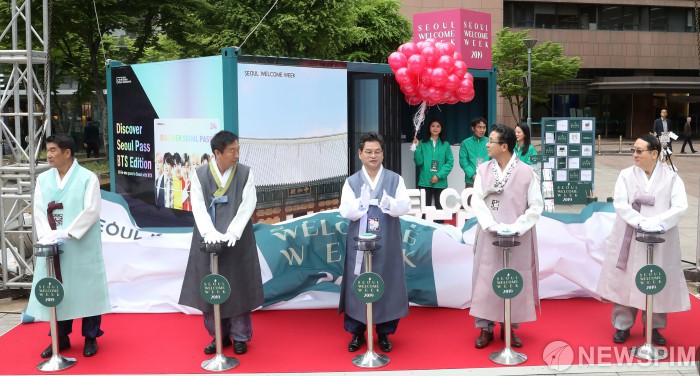 [서울=뉴스핌] 정일구 기자 = 26일 오전 서울 중구 명동관광정보센터에서 열린 외국인 관광객 환대주간 개막식에서 참석자들이 명동 환대센터 제막식을 하고 있다. 서울시는 이날부터 5월 6일까지 11일간을 '2019년 외국인 관광객 환대주간'으로 지정하고 외국인 손님을 맞이하기 위한 대대적인 환대 행사를 개최한다. 2019.04.26 mironj19@newspim.com