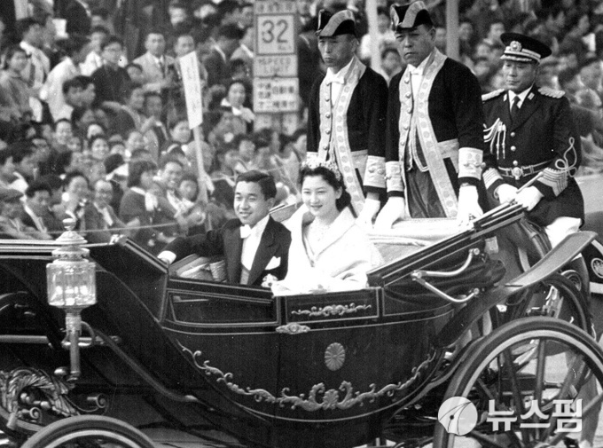 | [도쿄 로이터=뉴스핌] 오영상 전문기자 = 지난 1959년 4월 10일 결혼식 을 올린 아키히토(明仁) 일왕 부부가 웨딩 퍼레이드를 하고 있다. 1959.04.10 |