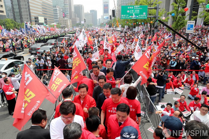 [서울=뉴스핌] 김학선 기자 = 자유한국당 의원들이 4일 오후 서울 광화문 세종문화회관 앞에서 열린 '문재인 STOP!, 국민이 심판합니다!' 3차 규탄대회에서 깃발을 들고 참석자들에게 인사를 하고 있다. 2019.05.04 yooksa@newspim.com