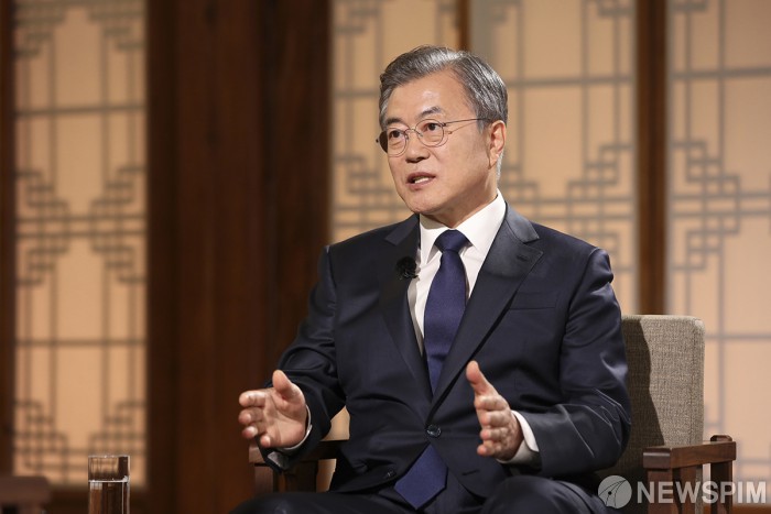 [서울=뉴스핌] 문재인 대통령이 9일 오후 청와대 상춘재에서 열린 문재인 정부 2년 특집 대담 ‘대통령에게 묻는다’에서 사회자의 질문에 답변하고 있다.[사진=청와대] 2019.05.09.