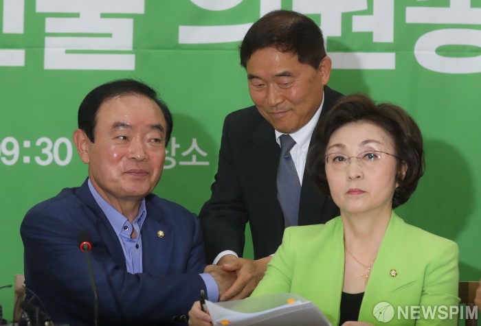 [서울=뉴스핌] 최상수 기자 = 장병완 민주평화당 원내대표, 황주홍 원내대표 후보가 13일 오전 서울 여의도 국회에서 열린 원내대표 선출 의원총회에서 악수를 나누고 있다. 2019.05.13 kilroy023@newspim.com