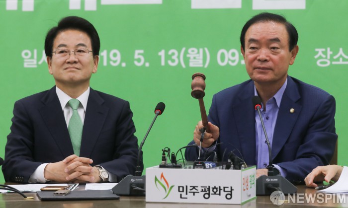 [서울=뉴스핌] 최상수 기자 = 장병완 민주평화당 원내대표가 13일 오전 서울 여의도 국회에서 열린 원내대표 선출 의원총회에서 의사봉을 두드리고 있다. 2019.05.13 kilroy023@newspim.com