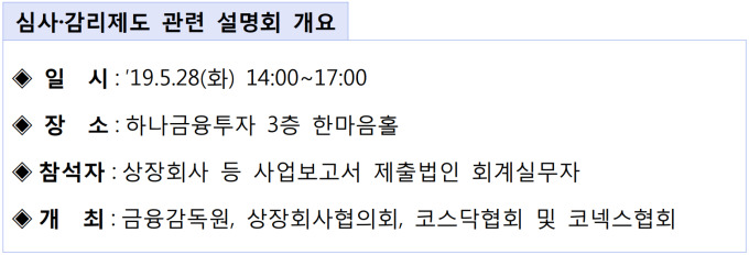 [서울=뉴스핌] 김형락 기자 = 금융감독원은 상장회사를 대상으로 개정 외부감사규정에 따른 심사·감리제도 설명회를 오는 28일 개최한다고 20일 밝혔다.