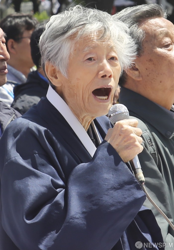 [서울=뉴스핌] 이한결 인턴기자 = 백기완 통일문제연구소장이 20일 오전 서울 종로구 청와대 분수대 앞에서 열린 ‘전교조 법외노조, 박근혜의 민주노조·참교육 파괴만행! 문재인 정부가 취소하라!’ 전국 시민사회원로·단체 기자회견 및 촉구서한 전달에서 여는 말을 하고 있다. 2019.05.20 alwaysame@newspim.com