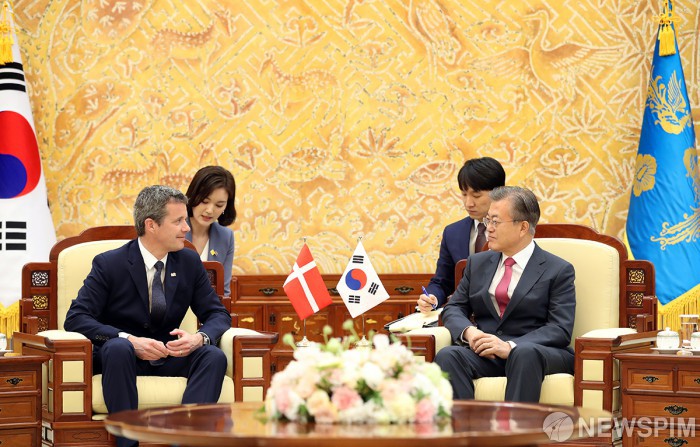 [서울=뉴스핌] 문재인 대통령이 20일 오전 청와대에서 한·덴마크 수교 60주년을 맞아 방한한 덴마크의 프레데릭 크리스티안 왕세자를 만나 이야기를 나누고 있다.[사진=청와대] 2019.5.20