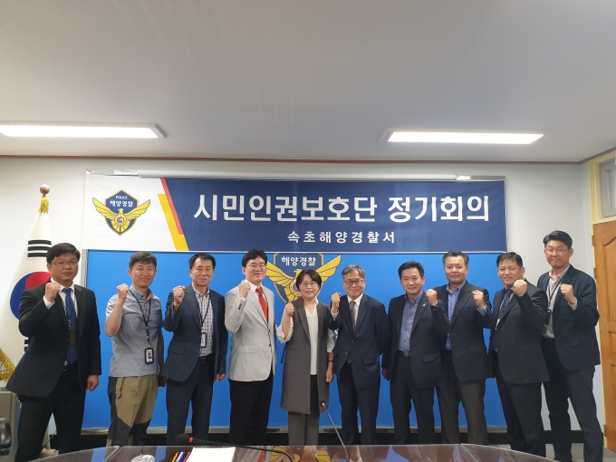 | 속초해양경찰서 시민인권보호단이 21일 2층 회의실에서 올 상반기 정기회의를 갖고 화이핑을 외치며 사진을 찍고 있다.[사진=속초해양경찰서] |
