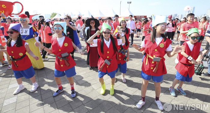 [서울=뉴스핌] 이형석 기자 = 26일 오전 서울 광진구 뚝섬 한강공원에서 열린 롯데 스타일런에서 이색 복장을 한 참가자들이 달리기를 앞두고 준비운동을 하고 있다. 2019.05.26 leehs@newspim.com