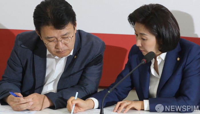 [서울=뉴스핌] 최상수 기자 = 나경원 자유한국당 원내대표(오른쪽), 정용기 정책위의장(왼쪽)이 31일 오전 서울 여의도 국회에서 열린 국정원 관권선거 의혹 대책위원회 회의에서 대화를 나누고 있다. 2019.05.31 kilroy023@newspim.com