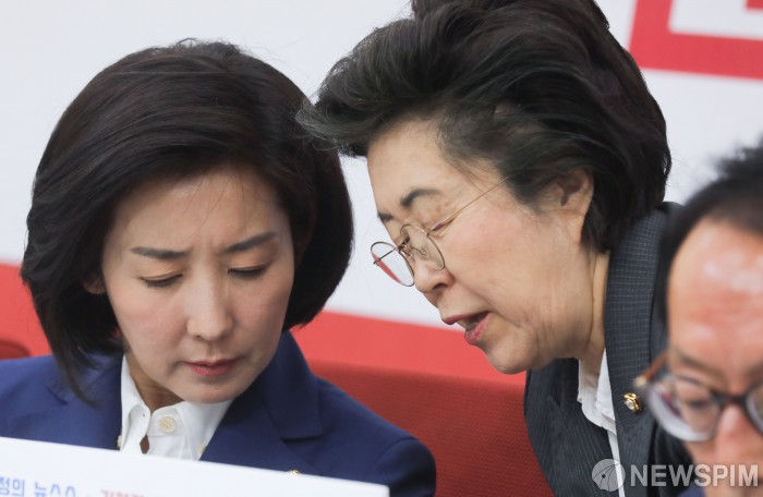 [서울=뉴스핌] 최상수 기자 = 나경원 자유한국당 원내대표, 이은재 의원이 31일 오전 서울 여의도 국회에서 열린 국정원 관권선거 의혹 대책위원회 회의에서 대화를 나누고 있다. 2019.05.31 kilroy023@newspim.com