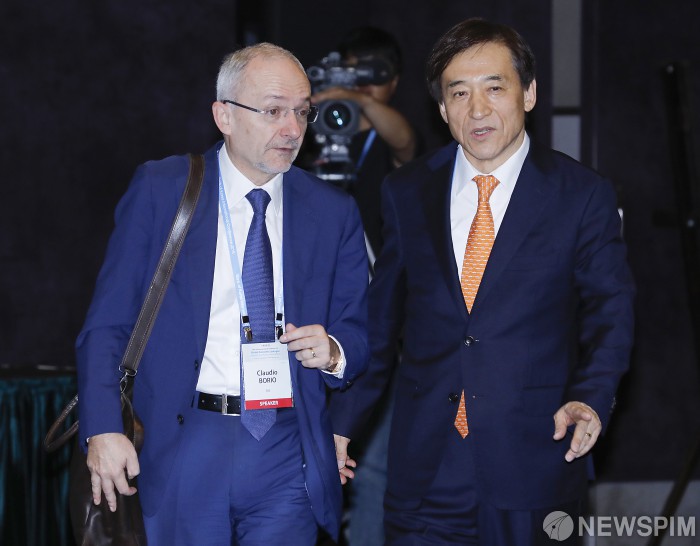 [서울=뉴스핌] 윤창빈 기자 = 이주열 한국은행 총재(오른쪽부터), 클라우디오 보리오 국제결제은행(BIS) 통화경제국장이 3일 오전 서울 중구 웨스틴 조선호텔에서 열린 ‘2019 BOK 국제컨퍼런스’에 참석하고 있다. 2019.06.03 pangbin@newspim.com