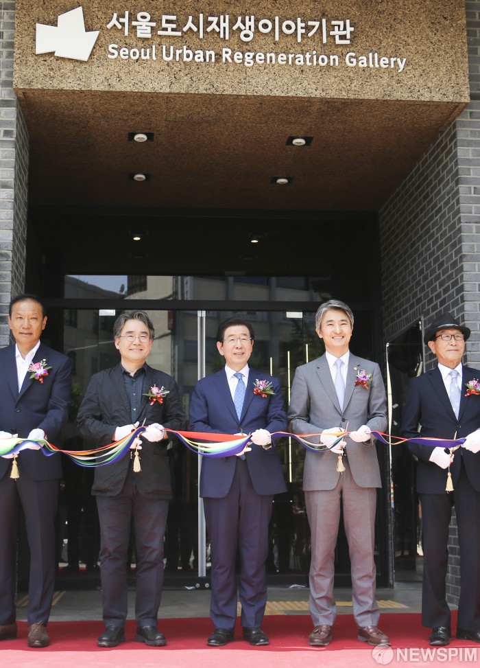 [서울=뉴스핌] 이한결 기자 = 박원순 서울시장, 김인제 서울시 도시계획관리위원회 위원장, 이충기 서울시 도시재생 명예시장 및 내외빈이 4일 오후 서울 종로구 돈의문박물관마을에서 열린 ‘서울도시재생이야기관 개관식’에서 테이프 커팅을 하고 있다. 2019.06.04 alwaysame@newspim.com