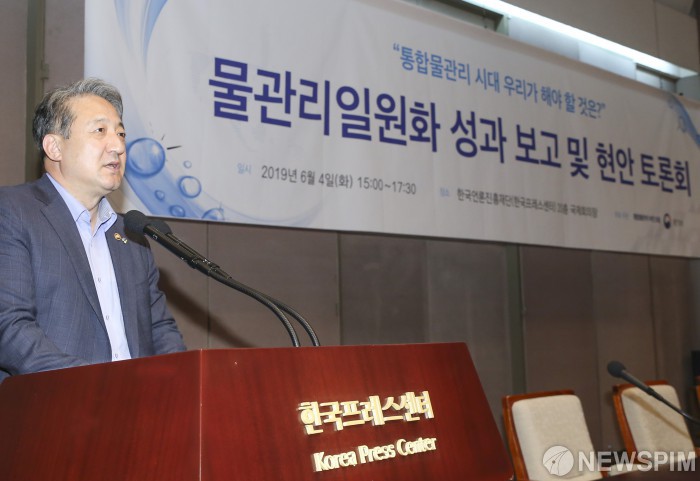 [서울=뉴스핌] 이한결 기자 = 박천규 환경부 차관이 4일 오후 서울 중구 한국프레스센터에서 열린 ‘물관리일원화 성과 보고 및 현안 토론회’에서 축사를 하고 있다. 2019.06.04 alwaysame@newspim.com