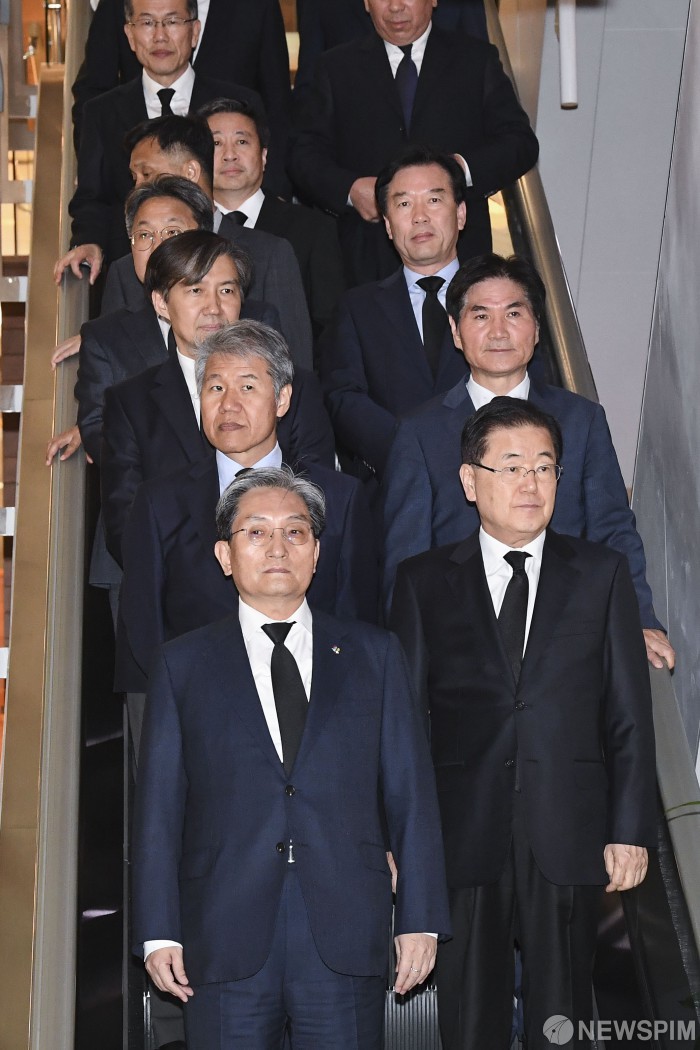 [서울=뉴스핌] 정일구 기자 = 노영민 대통령비서실장, 조국 민정수석 등 청와대 수석 조문단이 11일 오후 서울 서대문구 세브란스병원 장례식장에 마련된 고(故) 이희호 여사의 빈소에 들어서고 있다. 2019.06.11 mironj19@newspim.com