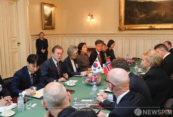 [서울= 뉴스핌] 문재인 대통령이 13일 오전 노르웨이 오슬로 총리 관저에서 솔베르그 총리와 정상회담을 하고 있다. [사진=청와대페이스북] 2019.6.14