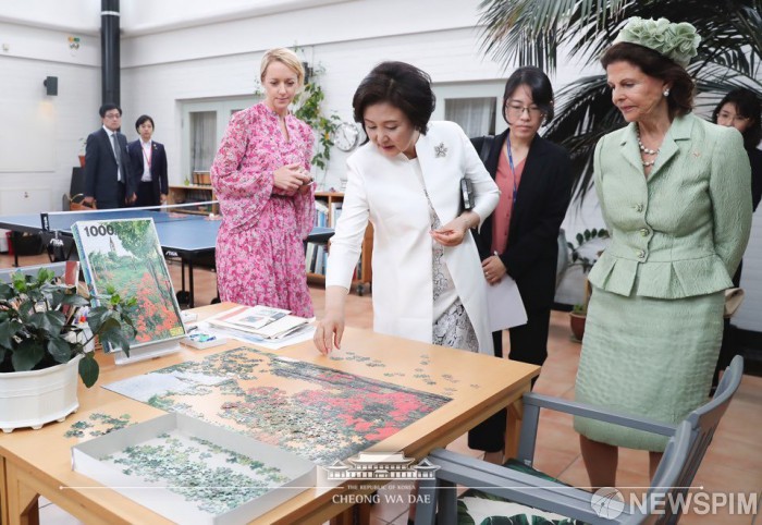 [서울= 뉴스핌] 김정숙 여사가 실비아 왕비와 함께 14일(현지시간) 스웨덴 스톡홀름 왕립치매지원센터 ‘실비아홈’을 방문해 시설을 둘러보고 있다. [사진=청와대 페이스북] 2019.6.14