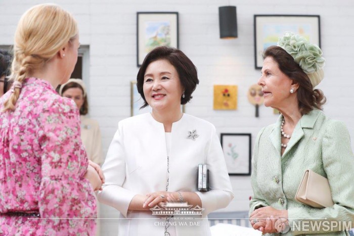 [서울= 뉴스핌] 김정숙 여사가 실비아 왕비(오른쪽)와 함께 14일 오전(현지시간) 스톡홀름 왕립치매지원센터 ‘실비아홈’을 방문해 테그만 실비아홈 차장에게 시설 설명을 듣고 있다. [사진=청와대페이스북] 2019.6.14
