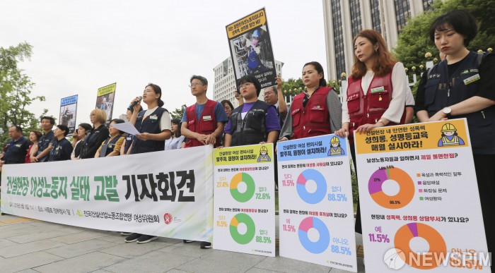 [서울=뉴스핌] 이한결 기자 = 김경신 건설산업연맹 여성위원장이 18일 오전 서울 종로구 정부서울청사 정문에서 열린 ‘건설현장 여성노동자 실태고발 기자회견’에서 여는말을 하고 있다. 2019.06.18 alwaysame@newspim.com