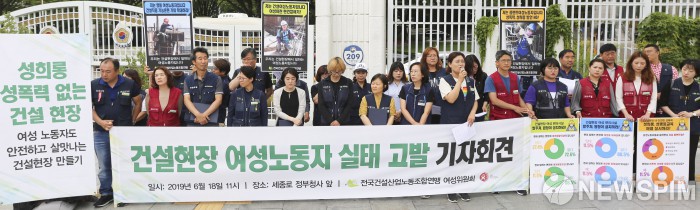 [서울=뉴스핌] 이한결 기자 = 김경신 건설산업연맹 여성위원장이 18일 오전 서울 종로구 정부서울청사 정문에서 열린 ‘건설현장 여성노동자 실태고발 기자회견’에서 여는말을 하고 있다. 2019.06.18 alwaysame@newspim.com