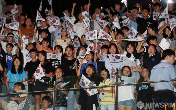 [서울=뉴스핌] 정일구 기자 = 25일 오전 서울 중구 장충체육관에서 열린 6.25전쟁 제69주년 행사에서 어린이들이 태극기를 흔들고 있다. 2019.06.25 mironj19@newspim.com
