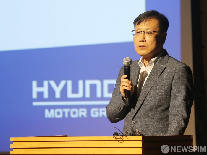 [고양=뉴스핌] 윤창빈 기자 = 주성백 현대기아자동차 파워트레인1센터장이 3일 오전 경기 고양시 현대모터스튜디오고양에서 열린 현대자동차·기아자동차 신기술 미디어 설명회에서 환영사를 하고 있다. 2019.07.03 pangbin@newspim.com