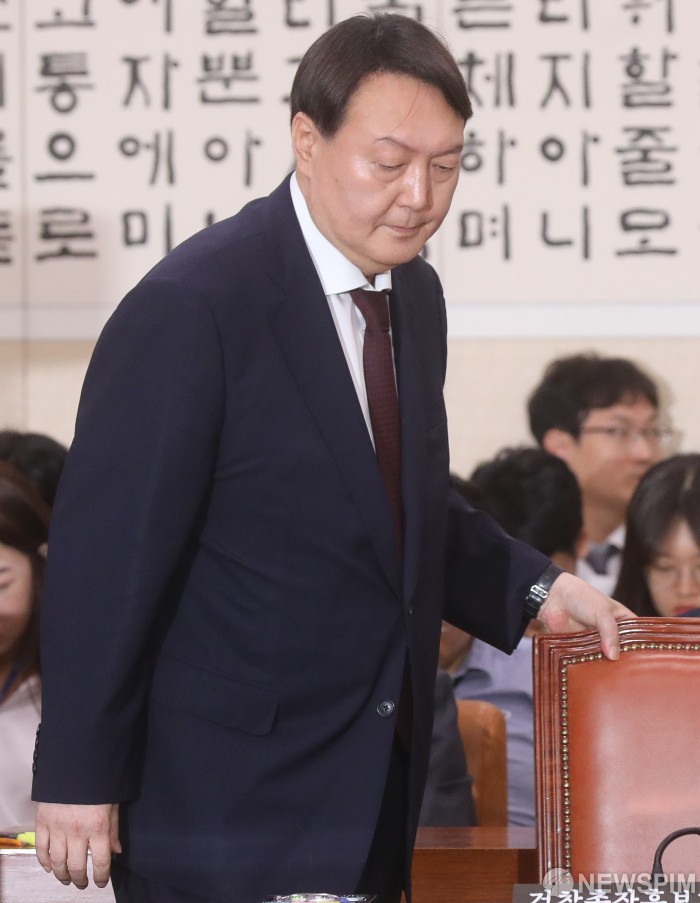 [서울=뉴스핌] 최상수 기자 = 윤석열 검찰총장 후보자가 8일 오전 서울 여의도 국회 법제사법위원회에서 열린 본인의 인사청문회에서 모두발언을 마친 뒤 자리로 향하고 있다. 2019.07.08 kilroy023@newspim.com