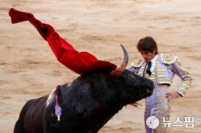 [팜플로나 로이터=뉴스핌] 김근철 기자=스페인 팜플로나에서 10일(현지시간) 열린 산 페르민 축제에서 투우사가 황소를 상대로 투우 경기를 벌이고 있다. 2019.07.10.