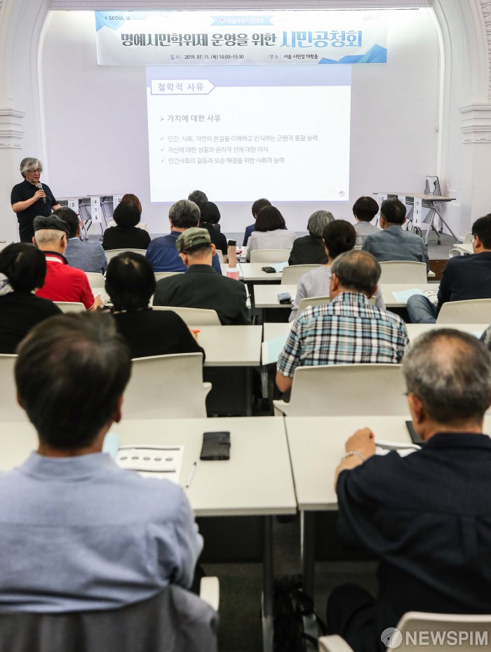[서울=뉴스핌] 윤창빈 기자 = 11일 오후 서울 중구 서울시청에서 열린 명예시민학위제 운영을 위한 시민공청회에서 참석자들이 강연자의 강의에 집중하고 있다. 2019.07.11 pangbin@newspim.com