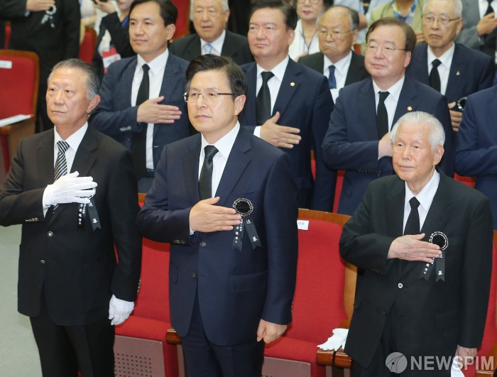 [서울=뉴스핌] 윤창빈 기자 = 신철식 기념사업회 회장(왼쪽부터), 황교안 자유한국당 대표, 이인수 박사가 19일 오전 서울 동작구 국립서울현충원 현충관에서 열린 ‘우남 이승만 건국대통령 서거 54주기 추모식’에서 국민의례를 하고 있다. 2019.07.19 pangbin@newspim.com