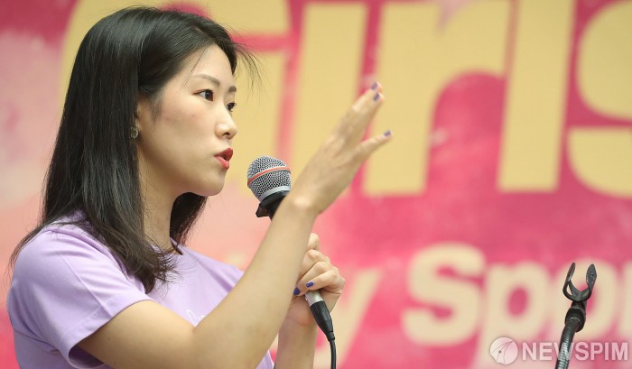[서울=뉴스핌] 정일구 기자 = 송한나래 아이스클라이밍 선수가 20일 오전 서울 중구 서울YWCA회관에서 열린 '스포츠 여성 리더와 함께하는 토크콘서트'에서 강연을 하고 있다. 2019.07.20 mironj19@newspim.com