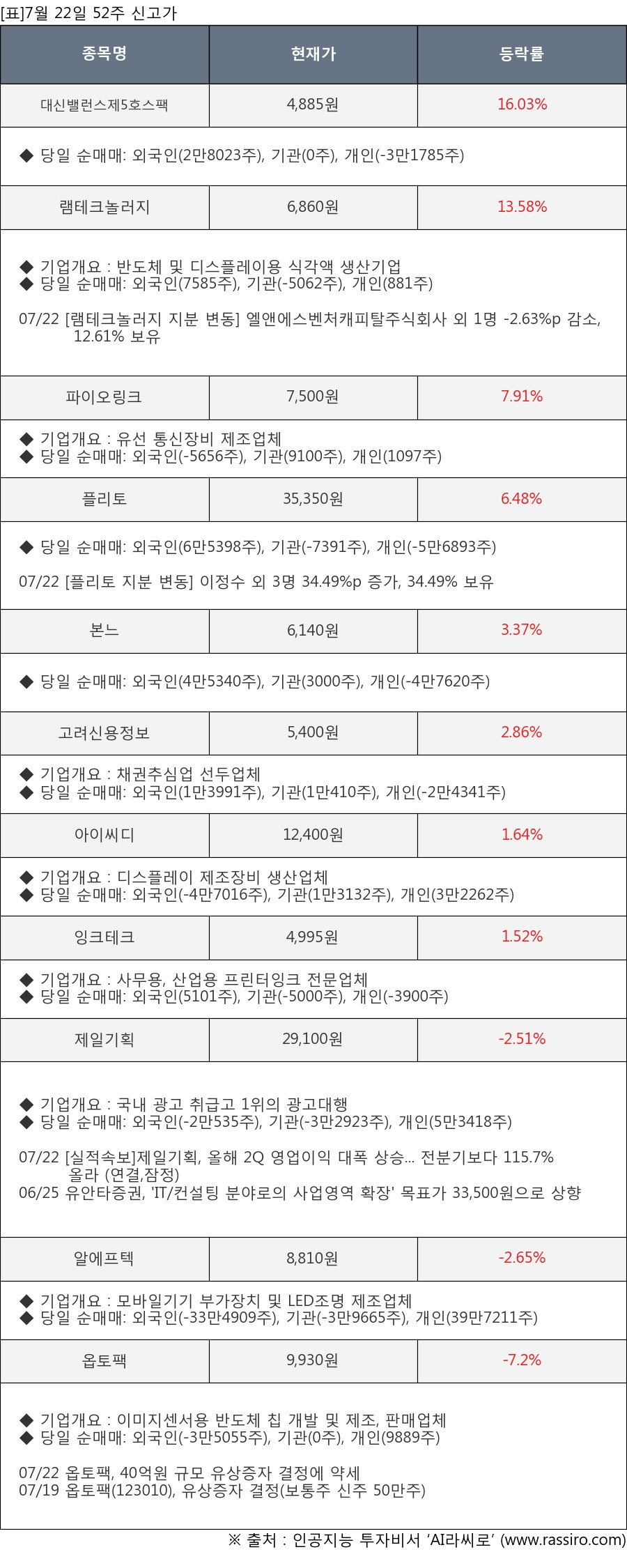 ※ 관련 종목: 대신밸런스제5호스팩, 램테크놀러지, 파이오링크, 플리토, 본느, 고려신용정보, 아이씨디, 잉크테크, 제일기획, 알에프텍, 옵토팩