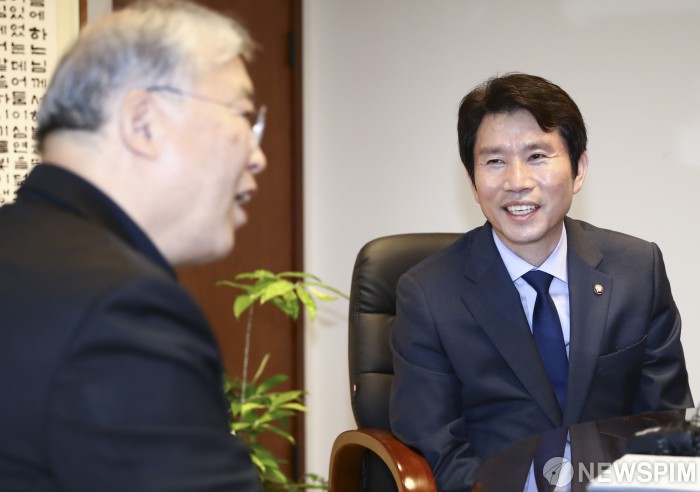 [서울=뉴스핌] 이한결 기자 = 이인영 더불어민주당 원내대표가 25일 오후 서울 중구 한국 천주교 서울대교구청에서 사회적 대타협을 위한 소통 행보의 일환으로 염수정 천주교 추기경을 예방하고 있다. 2019.07.25 alwaysame@newspim.com
