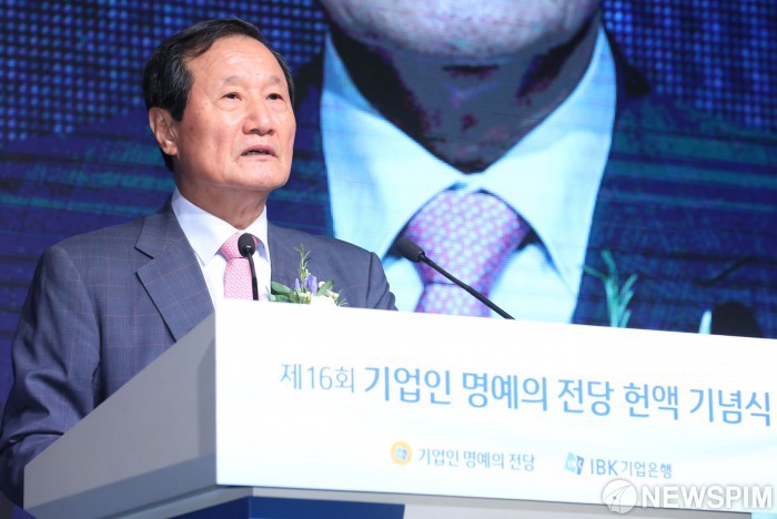 [서울=뉴스핌] 백인혁 기자 = 윤증현 선정위원장이 26일 오전 서울 중구 기업은행 본점에서 열린 '제 16회 기업인 명예의 전당 헌액식'에서 선정사를 하고 있다. 2019.07.26 dlsgur9757@newspim.com