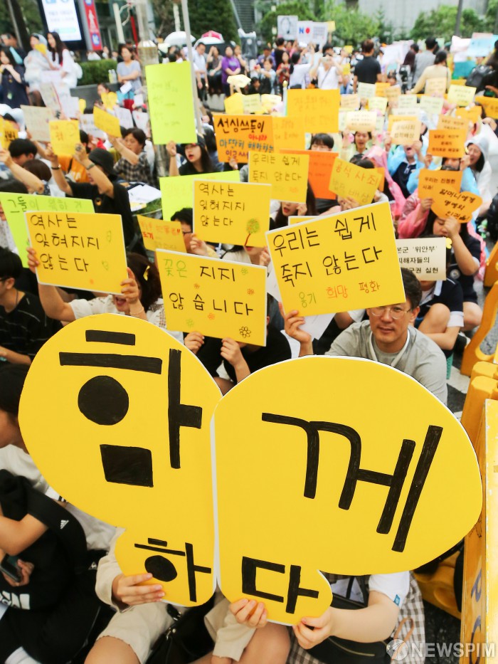 [서울=뉴스핌] 윤창빈 기자 = 31일 오후 서울 종로구 옛 일본 대사관 앞에서 열린 제1398차 수요집회에서 참가자들이 피켓을 들고 구호를 외치고 있다. 2019.07.31 pangbin@newspim.com