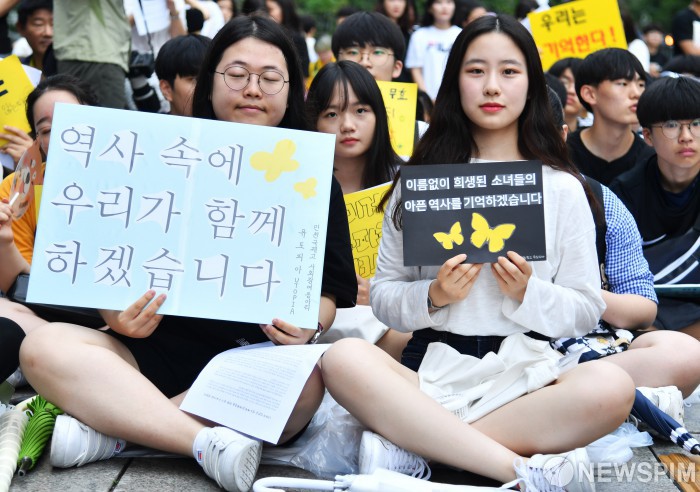 [서울=뉴스핌] 윤창빈 기자 = 31일 오후 서울 종로구 옛 일본 대사관 앞에서 열린 제1398차 수요집회에서 참가자들이 피켓을 들고 구호를 외치고 있다. 2019.07.31 pangbin@newspim.com