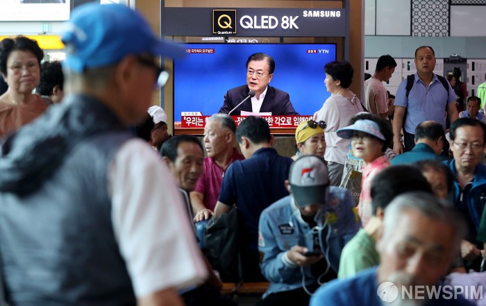 [서울=뉴스핌] 정일구 기자 = 일본 정부가 한국을 '화이트리스트'(수출심사 우대국)에서 제외한 2일 오후 서울 용산구 서울역에서 시민들이 문재인 대통령의 임시 국무회의 모두발언 생중계를 지켜보고 있다. 2019.08.02 mironj19@newspim.com