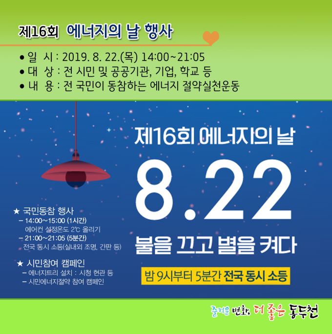[동두천=뉴스핌] 양상현 기자 = 경기 동두천시는 오는 22일 ‘제16회 에너지의 날’ 행사를 추진한다고 5일 밝혔다.